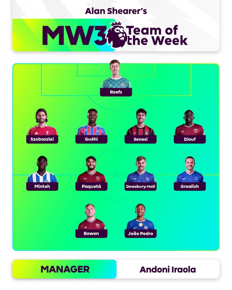 9月3日,英超传奇射手阿兰-希勒公布了本轮联赛最佳阵容名单,若昂-佩德罗、索博斯洛伊、鲍文与格拉利什等球员悉数入选。