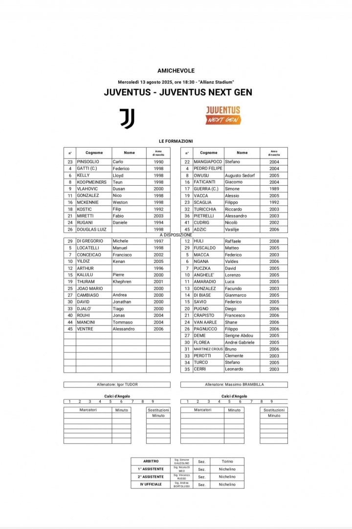 尤文一线队先发:门将平索里奥(23号),后防线由加蒂(4号)、凯利(6号)、鲁加尼(24号)组成,中场配置包括库普梅纳斯(8号)、麦肯尼(16号)、米雷蒂(21号)和道格拉斯-路易斯(26号),锋线则由弗拉霍维奇(9号)搭档尼古拉斯-冈萨雷斯(11号),科斯蒂奇(18号)出任边路